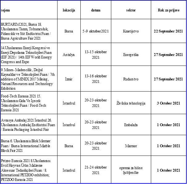 Veleposlaništvo Turčije vabi zainteresirana podjetja k udeležbi na spodaj navedenih sejmih: