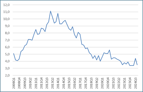 Slika 2: Stopnja brezposelnosti v Sloveniji (%) med leti 2008 in 2024 (vir: SURS)