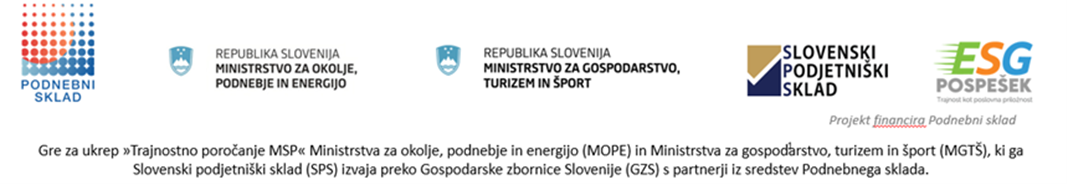 Brezplačno usposabljanje za prostovoljno trajnostno poročanje za MSP v okviru ESG POSPEŠEK - TRAJNOST KOT POSLOVNA PRILOŽNOST - Postojna, Modul 3- 18.12.2025 Vabilo na BREZPLAČNO USPOSABLJANJE ZA PROSTOVOLJNO TRAJNOSTNO POROČANJE ZA MIKRO, MALA IN SREDNJA PODJETJA (MSP) V OKVIRU PROJEKTA ESG POSPEŠE